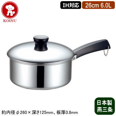 他の18-0ソースパン&ソースポットはこちら 【商品仕様】 ●サイズ/約内径φ260×深さ125mm、板厚0.8mm ●容量/約6.0L ●材質/18-0ステンレス鋼●IH電磁調理器等のオール熱源対応 ●日本製(新潟県燕三条) ※メーカーに在庫がある場合は3営業日以内に発送させて いただきますが、稀に在庫がない場合もございますので、 お急ぎの場合はお問い合わせください。