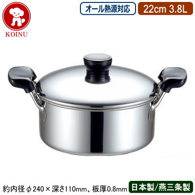 他の18-0ソースパン&ソースポットはこちら 【商品仕様】 ●サイズ/約内径φ240×深さ110mm、板厚0.8mm ●容量/約4.9L ●材質/18-0ステンレス鋼●IH電磁調理器等のオール熱源対応 ●日本製(新潟県燕三条) ※メーカーに在庫がある場合は3営業日以内に発送させて いただきますが、稀に在庫がない場合もございますので、 お急ぎの場合はお問い合わせください。