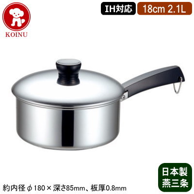 他の18-0ソースパン&ソースポットはこちら 【商品仕様】 ●サイズ/約内径φ180×深さ85mm、板厚0.8mm ●容量/約2.1L ●材質/18-0ステンレス鋼●IH電磁調理器等のオール熱源対応 ●日本製(新潟県燕三条) ※メーカーに在庫がある場合は3営業日以内に発送させて いただきますが、稀に在庫がない場合もございますので、 お急ぎの場合はお問い合わせください。
