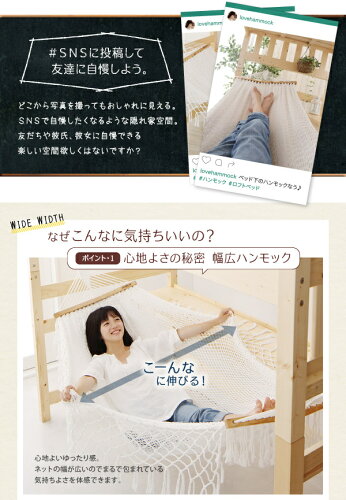 キーワードロフトベッド 木製 ハンモック付き ハイタイプ 棚付き バリエーション ▼ロフトベッド・2段ベッドシリーズ ●ハンモック付ロフトベッド ハンモックス ●階段ロフトベッドロータイプ ローステップ シンプルタイプ ●階段ロフトベッドロータイプ ローステップ ハンガーポール付タイプ ●階段ロフトベッドハイタイプ ヘイステップ シンプルタイプ ●階段ロフトベッドハイタイプ ヘイステップ ハンガーポール付タイプ ●棚コンセントライト付二段ベッド ミルキー ベッドフレームのみ ●棚コンセントライト付二段ベッド ミルキー 三つ折り天然素材パームマットレス付き ●ホワイト木目多段ベッド ホワイトリプル 3段ベッド ●ホワイト木目多段ベッド ホワイトリプル 2段ベッド ●ホワイト木目多段ベッド ホワイトリプル 親子ベッド ●棚コンセント付きロータイプ二段ベッド マイスペ ベッドフレームのみ ●棚コンセント付きロータイプ二段ベッド マイスペ 3つ折りカラーメッシュマットレス付き ●棚コンセント付きロータイプ二段ベッド マイスペ 薄型軽量ポケットコイルマットレス付き ●マイスペ 専用別売品(2段ベッド用パッド&シーツ2点セット)1個 ●マイスペ 専用別売品(2段ベッド用パッド&シーツ2点セット) 2個 ●棚コンセント付きアカシア材二段ベッド レドンド ベッドフレームのみ ●棚コンセント付きアカシア材二段ベッド レドンド 3つ折りカラーメッシュマットレス付き ●棚コンセント付きアカシア材二段ベッド レドンド 薄型軽量ボンネルコイルマットレス付き ●棚コンセント付きアカシア材二段ベッド レドンド 薄型軽量ポケットコイルマットレス付き ●棚コンセント付きアカシア材二段ベッド レドンド 専用別売品(2段ベッド用パッド&シーツ2点セット) 1個 ●レドンド専用別売品(2段ベッド用パッド&シーツ2点セット) 2個ハンモック付き ロフトベッド Hammox ハンモックス ▼ロフトベッド・2段ベッドシリーズ ●ハンモック付ロフトベッド ハンモックス ●階段ロフトベッドロータイプ ローステップ シンプルタイプ ●階段ロフトベッドロータイプ ローステップ ハンガーポール付タイプ ●階段ロフトベッドハイタイプ ヘイステップ シンプルタイプ ●階段ロフトベッドハイタイプ ヘイステップ ハンガーポール付タイプ ●棚コンセントライト付二段ベッド ミルキー ベッドフレームのみ ●棚コンセントライト付二段ベッド ミルキー 三つ折り天然素材パームマットレス付き ●ホワイト木目多段ベッド ホワイトリプル 3段ベッド ●ホワイト木目多段ベッド ホワイトリプル 2段ベッド ●ホワイト木目多段ベッド ホワイトリプル 親子ベッド ●棚コンセント付きロータイプ二段ベッド マイスペ ベッドフレームのみ ●棚コンセント付きロータイプ二段ベッド マイスペ 3つ折りカラーメッシュマットレス付き ●棚コンセント付きロータイプ二段ベッド マイスペ 薄型軽量ポケットコイルマットレス付き ●マイスペ 専用別売品(2段ベッド用パッド&シーツ2点セット)1個 ●マイスペ 専用別売品(2段ベッド用パッド&シーツ2点セット) 2個 ●棚コンセント付きアカシア材二段ベッド レドンド ベッドフレームのみ ●棚コンセント付きアカシア材二段ベッド レドンド 3つ折りカラーメッシュマットレス付き ●棚コンセント付きアカシア材二段ベッド レドンド 薄型軽量ボンネルコイルマットレス付き ●棚コンセント付きアカシア材二段ベッド レドンド 薄型軽量ポケットコイルマットレス付き ●棚コンセント付きアカシア材二段ベッド レドンド 専用別売品(2段ベッド用パッド&シーツ2点セット) 1個 ●レドンド専用別売品(2段ベッド用パッド&シーツ2点セット) 2個