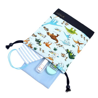 商品名巾着 中 マチ無し給食袋(ネームタグ付き) 発見!探検!恐竜大陸(ライトブルー) × オックス・紺商品の特長1.ランチョンマットやお箸セットが収納できる給食袋ランチョンマットやお箸セット、マスク、カトラリーケースなどが納まるサイズ感。